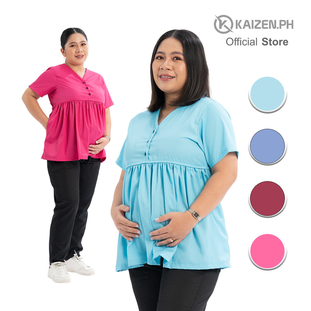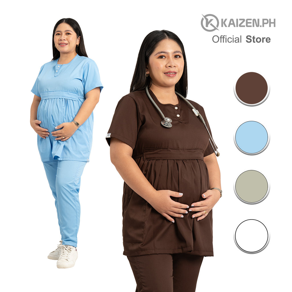 Maternity Scrub Suit KSM-02 2-Buttons Empire Cut Sheared 2-pockets Top, 2-pocket Colored Pants