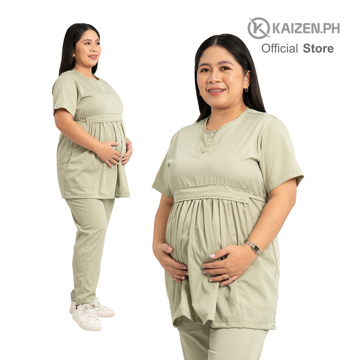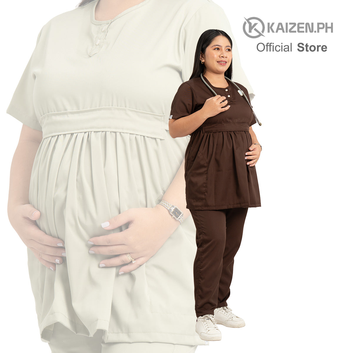 Maternity Scrub Suit KSM-02 2-Buttons Empire Cut Sheared 2-pockets Top, 2-pocket Colored Pants